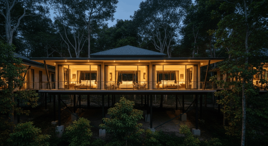 - エコリゾートやホテル: タイや東南アジアのエコリゾートでは、高床式のデザインを積極的に取り入れることで、地域の自然景観に溶け込み、涼しく快適な宿泊体験を提供しています。