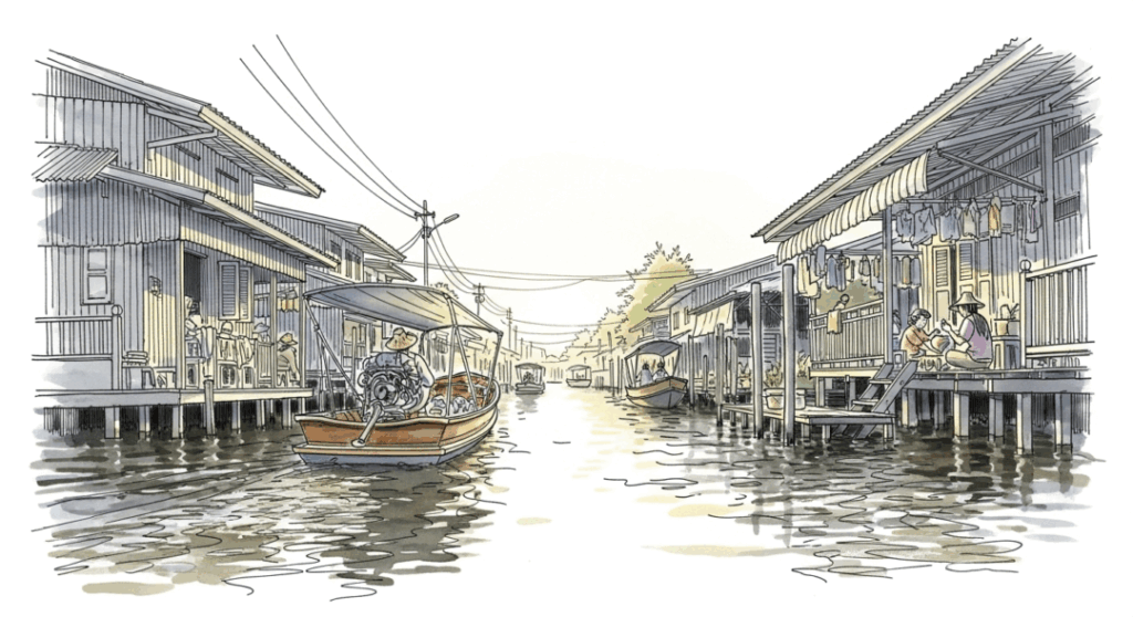 - メークロン市場や水上マーケット周辺: 運河沿いや川岸に並ぶ高床式の家屋は、水と共にあるタイの生活を感じさせてくれます。