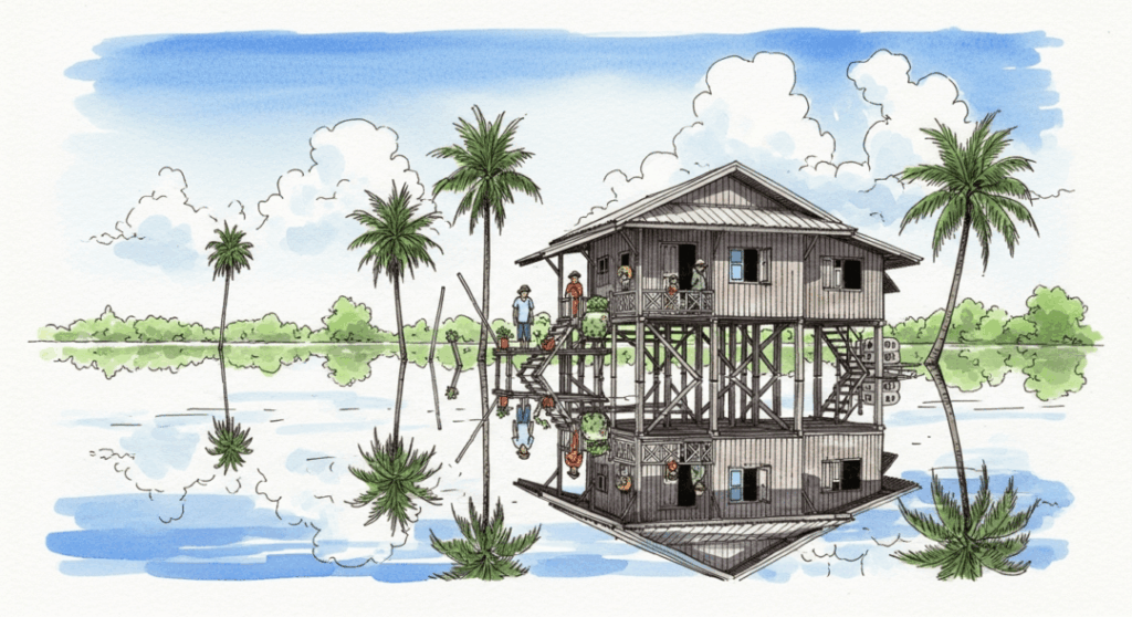 高床式住居は、洪水時にはまるで大地に繋がれながらも、水に浮かぶ「動かない船」のよう。自然の猛威を力ずくでねじ伏せるのではなく、その変化に柔軟に適応し、共生する知恵の結晶なのです。