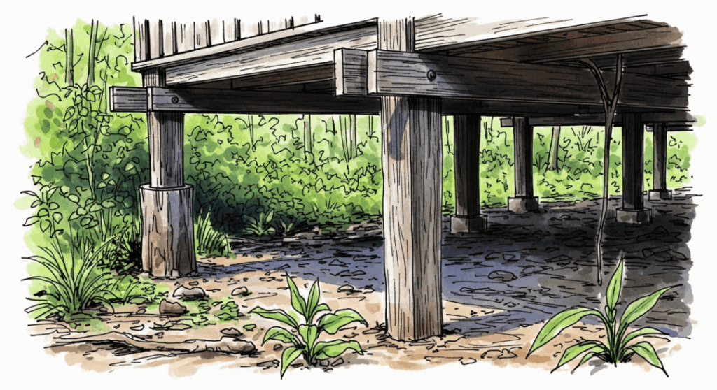 - 熱だまりの防止: 熱い空気は上昇する性質があります。床下に空間があることで、地面からの熱気が直接室内にこもらず、効果的に排出されます。家がまるで地面から熱や湿気を吸い上げず、風を通して呼吸する「巨大な皮膚」のように機能していると言えるでしょう。