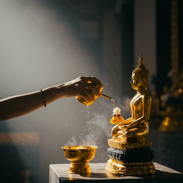 ソンクラーンの最も古い起源の一つは、仏像の清めである「ソンナムプラ」にあります。これは、仏像に香りの良い水をかけることで、仏様に敬意を示し、自身の罪を洗い流し、新しい年の功徳を積むという仏教的な儀式です。人々は寺院に集まり、静かに心を込めて仏像に水をかけ、無病息災や幸福を願いました。この水は、単なる「水」ではなく、祝福と浄化の力を宿す「聖水」として扱われます。この行為は、仏教徒にとって非常に重要な意味を持ち、ソンクラーンの精神的な核となっています。