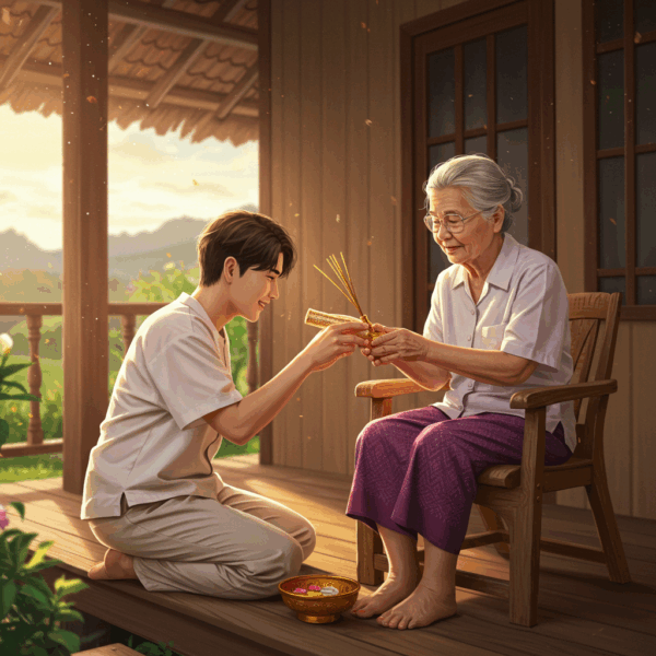 もう一つの重要な起源は、「ロードナムダムフアプーヤイ」という、年長者への敬意を表す儀式です。家族や地域社会の年長者の手に、そっと香りの良い水をかけて清め、健康と長寿を願います。年長者たちは、この清めの水を受けることで、子供や若者たちに祝福と教訓を授け、家族の絆を深めます。これは、目上の人を尊ぶタイの文化が色濃く反映された習慣であり、ソンクラーンが単なる祭りの騒ぎではなく、世代間のつながりを再確認する大切な機会であったことを示しています。このように、ソンクラーンはもともと、ごく少量の水を用いて、静かで心温まる形で執り行われる儀式だったのです。