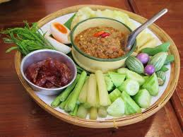 - 生野菜(ผักสด): キュウリ(แตงกวา)、白菜(ผักกาดขาว)、インゲン豆(ถั่วฝักยาว)、ディル(ผักชีลาว)など、ディップの辛さを中和する新鮮な野菜 。